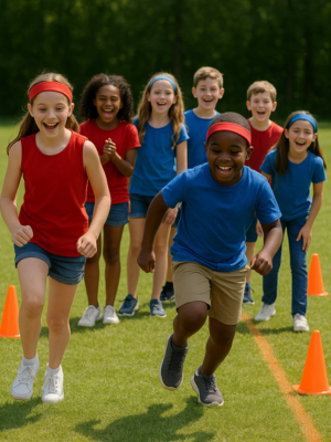 Set Up: Establish a playing area. Divide players into two teams. Players on teams line up behind one another at a starting point. Players will race to an end point at the opposite side of the playing field.