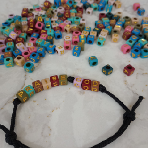 String the letters G-O-D to the right side of the middle knot. Making sure they face in the same direction as PRAISE.
