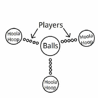 How to Play: place the balls at the center of the playing area. Divide players into teams of 4-6 players. You may need more that two teams depending on the size of your class. Designate team lines to extend out from the center with a Hoola-Hoop at the end of the