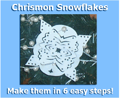 While making paper cut snowflakes with my children one Christmas, I wanted my designs to reflect the spiritual nature of the season. By trial and error I incorporated Chrismon designs into each snowflake. Hence, Chrismon Snowflake Ornaments were developed! The special way they are folded and cut gives them their three dimensional quality. Chrismon Snowflakes are reminiscent of German and Swiss Scherenschnitte, (the religious art/craft of intricate paper cutting).