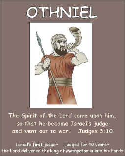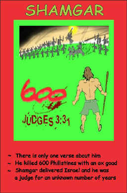 We have worked our way (in Sunday school 4-6th grade and in our Christian School K-6th grade) through the Old Testament over the course of about 7 years. We choose one verse a week and memorize it by playing a whole host of games and always put the verse to a familiar tune. It's always a verse within the course of study for the week. We are now up to Judges. I wasn't able to find any visuals pertaining to the Judges of Israel; so I made my own, with each card having a synopsis of their lives, see samples below. You may contact me if you are interested in receiving these lessons.