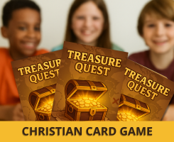 Don't miss our Christian card game -- Treasure Quest! In this exciting, Scripture-based adventure, players collect cards that reflect Kindness, Faith, Forgiveness, Service, and Sacrifice. It's a powerful way to grow godly character while having fun! Be the first to gather all five treasures and win the game -- and a heart set on things that truly matter. Available exclusively on our Etsy platform! Learn more.