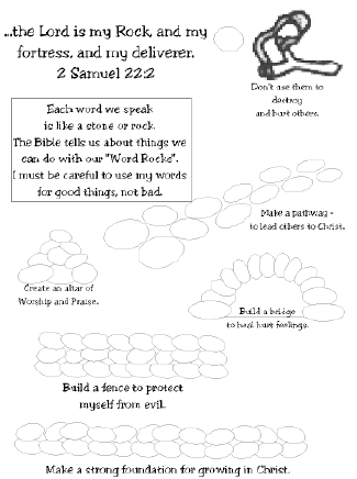 The kids really did seem to "get it" - in watching their "word rocks." A couple of the 8 year olds spoke about knowing someone they wanted to make a "path" to find Jesus - by using their words. There was good discussion and interaction. I made flannel graph "rocks" - using paper towel backing and we built the items on the color page before they colored them. Also, since this is a young group, I precut hearts from a mailing address label and stuck it to a small rock. They were able to dab red acrylic paint with a small sponge to make a good looking heart. They dabbed - then we had the lesson - then they took the label off. They were SO proud of the heart that they made! Then, while they colored the paper as we reviewed the story - I outlined each heart and put a cross in the center. I used an Sharpie Black marker. I quizzed them about what they could do with their rock and was surprised at how quickly they responded with - "Show it to someone and tell them about Jesus in the heart!"